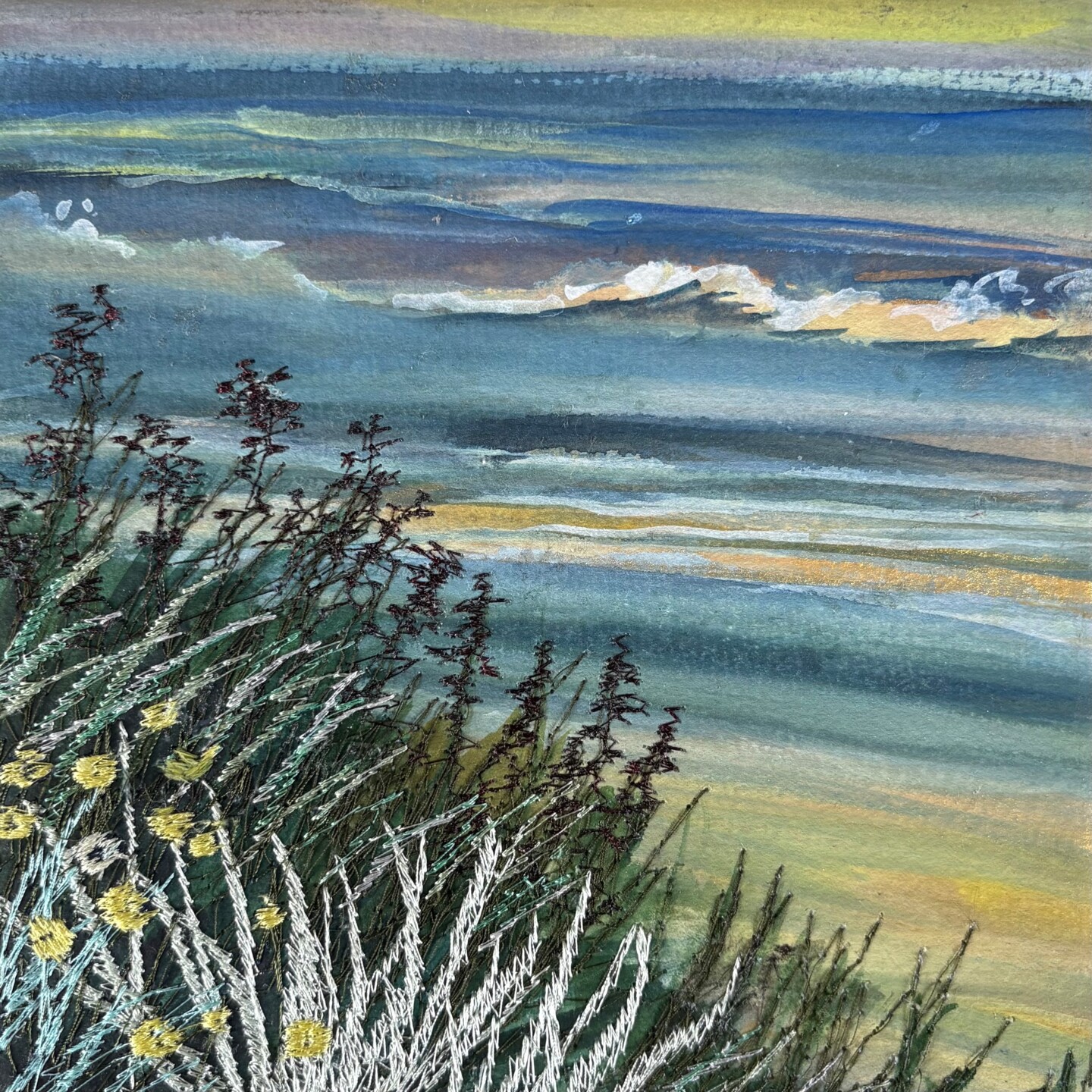When nature takes its course and shrouds the land with wild flowers, even weeds, I think it is an indication of healthy conditions for growth in its natural way. the groupings of weeds and beach flowers in the foreground add perspective and interest to the contrasting colours of the beach. There is much movement thanks to the different media that reacts differently to the changing lighting states