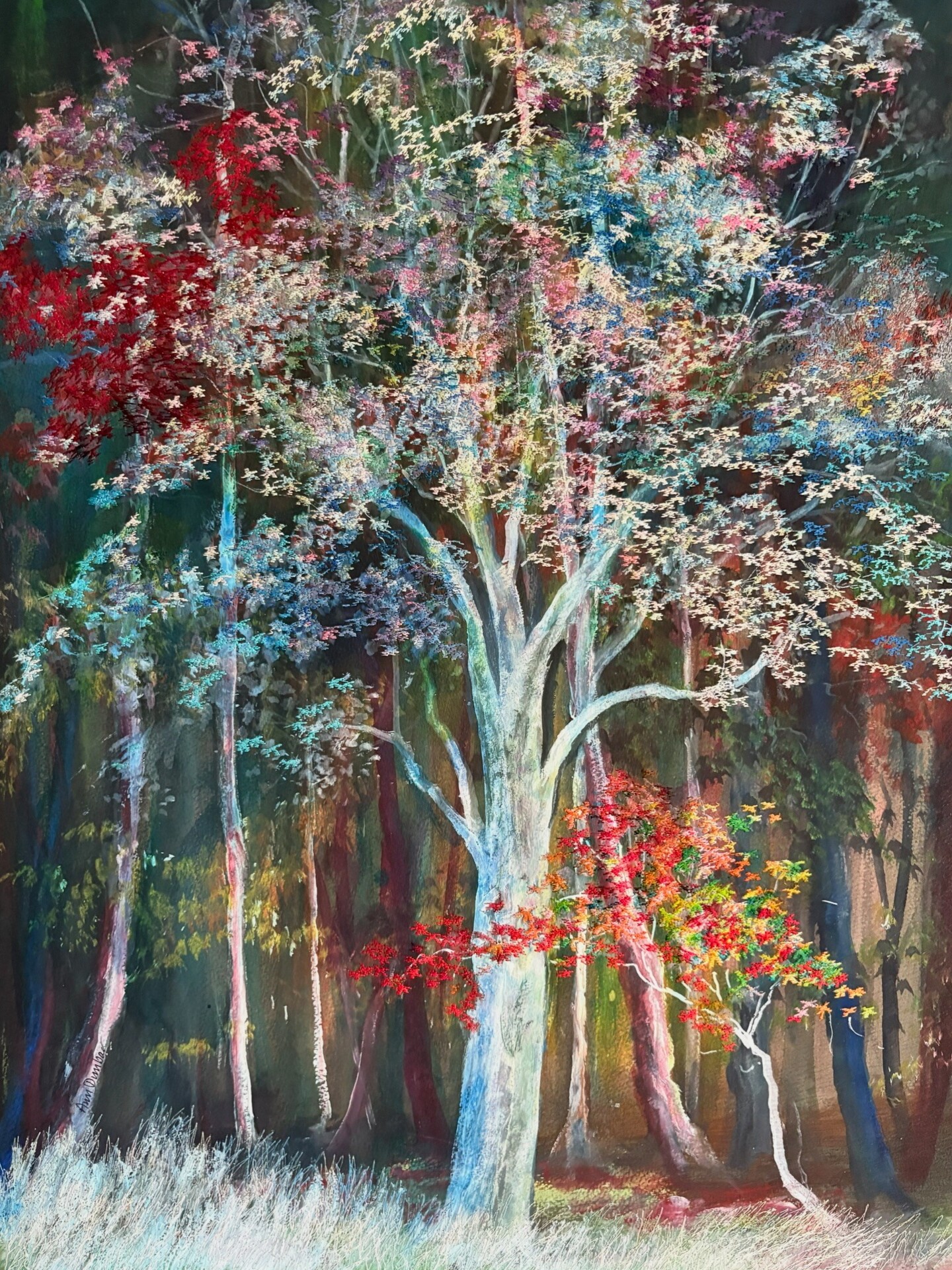 Beyond our world, there may be forests with tree that have the same form but their trunks and branches are white, their leaves have the same refractive effect with light like a butterfly's wings. This piece is perfect to be placed on a wall with little furniture around, so that one contemplate the array of colour and texture. Every colour of the spectrum is present, so all chakra is represented. The embroidery capture's amazing movement as the light upon it brings out three dimensional qualities.